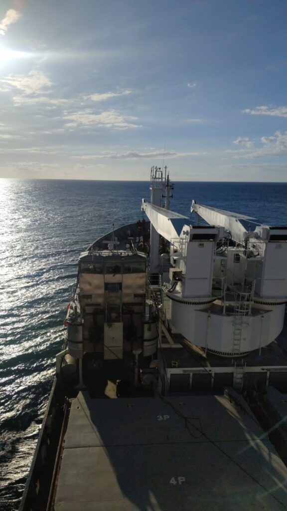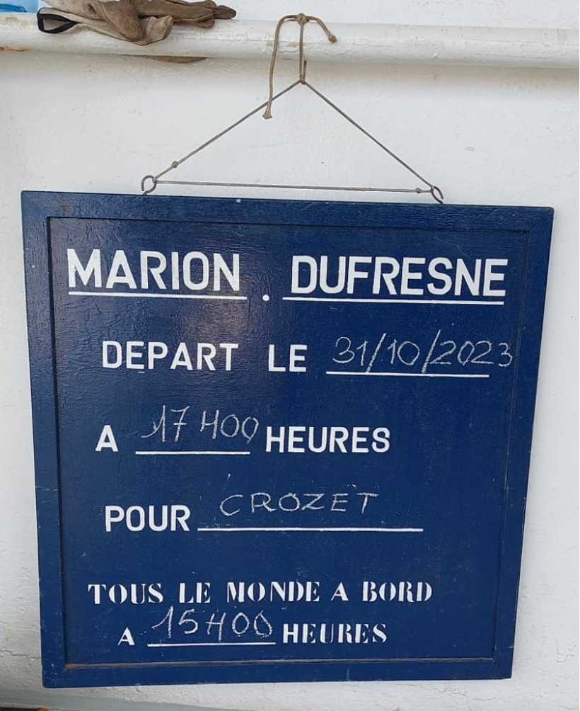 La veille du départ, avec Alan, nous allons déposer les sacs de tout notre petit monde au port, l’occasion pour nous de rencontrer enfin le Marion Dufresne ! C’est avec des étoiles dans les yeux que nous chargeons les valises sur le bateau.