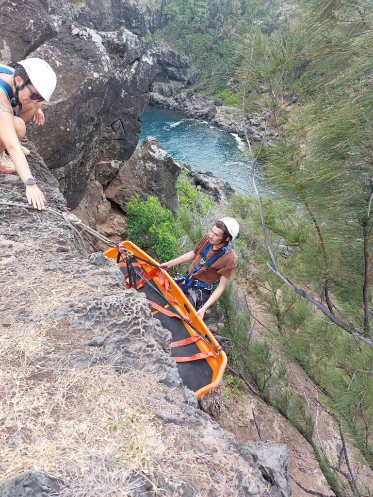 Nous apprenons aussi les bases du secours en montagne, car si quelqu’un se blesse ou tombe en bas d’une falaise, nous devrons le remonter sous la supervision du médecin. Nous avons appris à remonter une victime dans un brancard le long de la falaise, grâce à un mouflage, et à sécuriser le rappel en accrochant des cordes au rocher.
