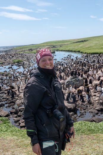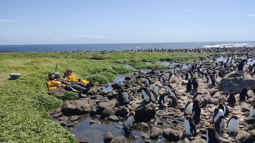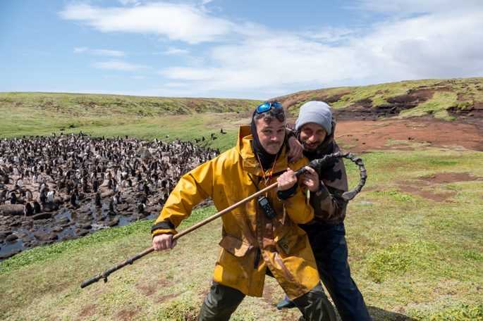 Dernier protocole pendant ce maxi tour, le transpondage des jeunes gorfous macaronis à Cap Cotter. Nous leur mettons des petites puces sous la peau, comme pour les chiens ou les chats. Il y a une station à l’entrée de la colonie, qui note les allées et venues des oiseaux tout au long de l’été. A cette période de l’année ils sont déjà assez grands. Ils ont tout juste commencé de muer et ils ont encore leur duvet de poussin tout doux.
