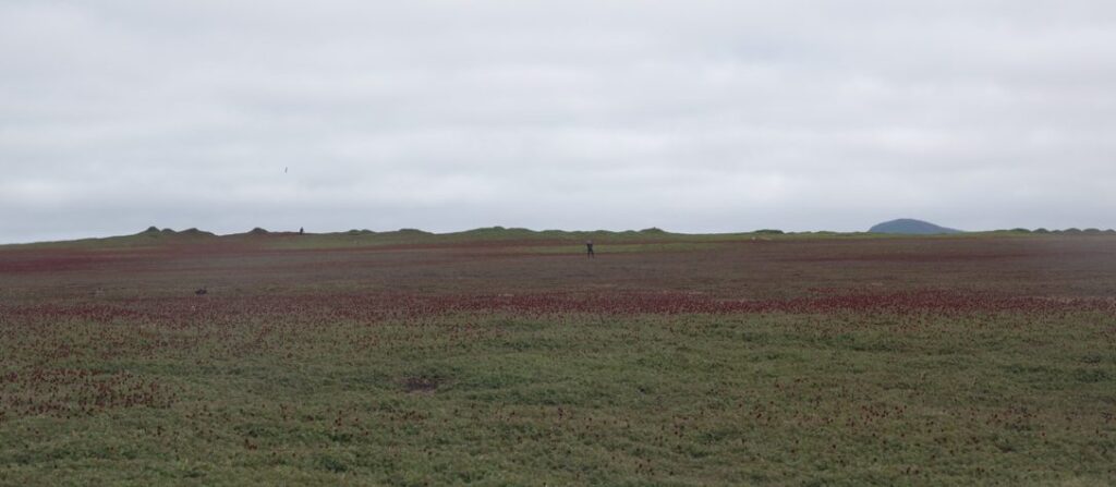 Dernière chose à propos des Otaries, dès que la température est plus « douce » elles vont s’amuser dans l’eau ce qui les rend incomptables, il faut donc se lever de bonne heure. Cette contrainte s’ajoute à la traversée du déversoir du Lac de Marville, trop dangereuse à marée haute. Cette journée là, ce fut un départ à 2h en pleine nuit pour arriver à 4h au lac, avec un ciel qui a explosé de nuances de roses. Les ambiances magiques que nous offre cette île sont infinies.