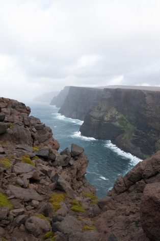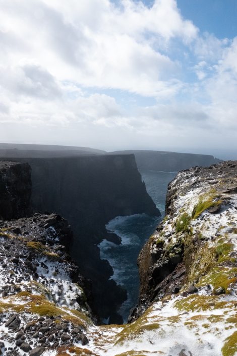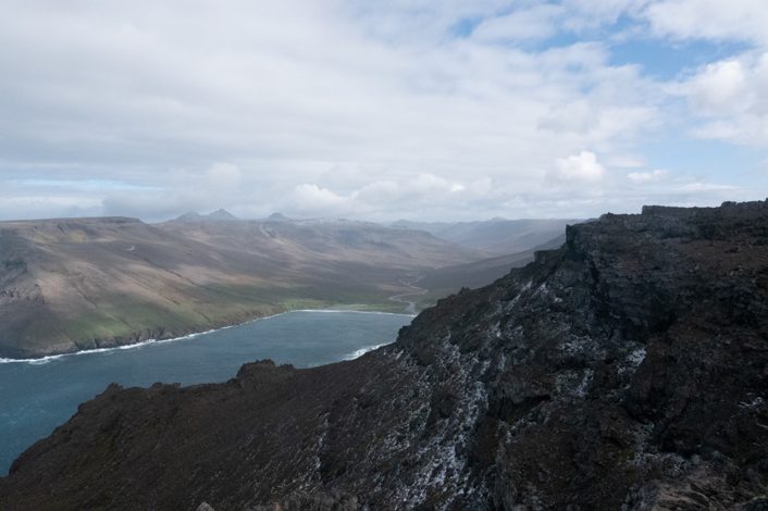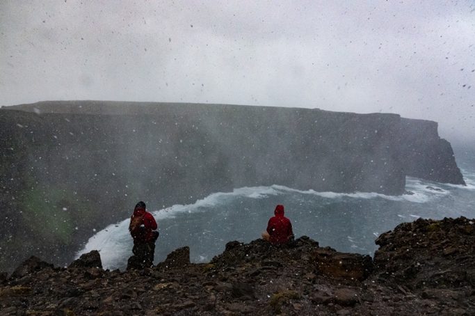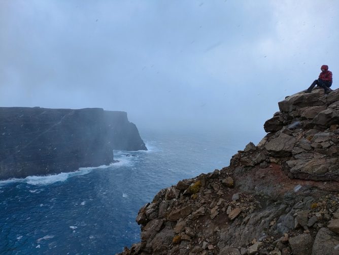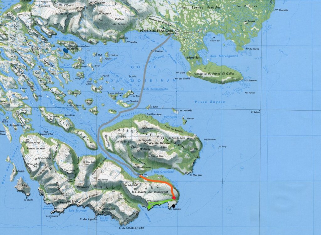 Le premier jour off, nous en avons profité pour aller à la baie de l’A-pic et jusqu’à l’Anse de l’Antarctique et le Mont Ferguson (trajet en vert sur la carte). A cet endroit les falaises plongent à pic sur 500 m directement dans la mer, et la prochaine terre en vue au Sud, c’est l’Antarctique. La vue était incroyable entre deux rayons de soleil et deux tempêtes de neige.