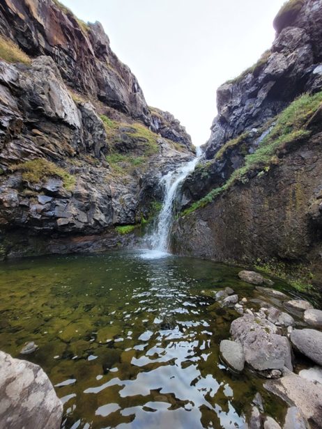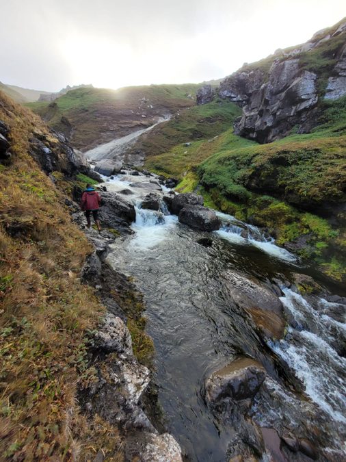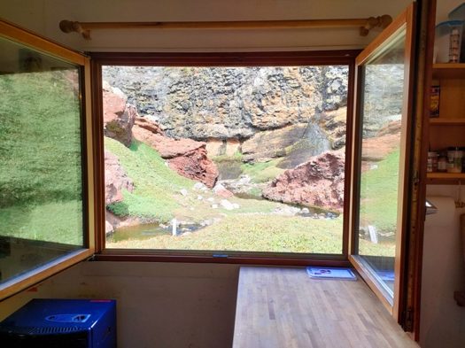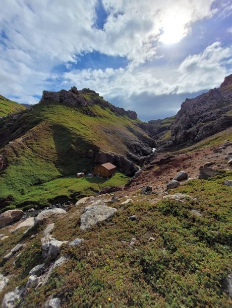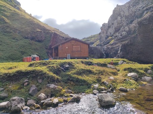 La cabane est située dans un canyon incroyable, rempli de cascades et de vasques d’eau. Il pourrait être qualifié de paradisiaque s’il faisait 25° de plus ! C’est quand même bien pratique pour le ravitaillement en eau, c’est une des seules cabanes où on ne la filtre pas. Dans la plupart des autres cabanes nous prenons l’eau dans des petit lac vaseux ou des rivières dans lesquels barbotent des otaries, manchots ou éléphants de mer …