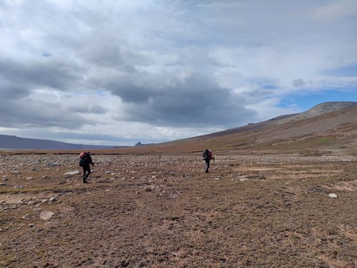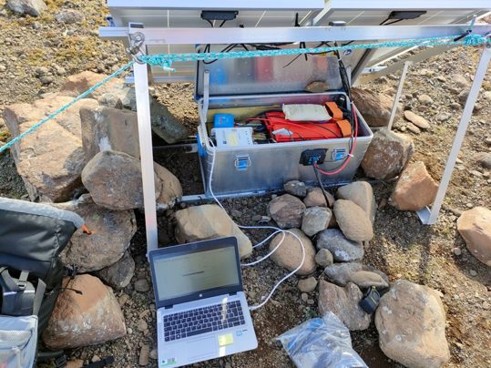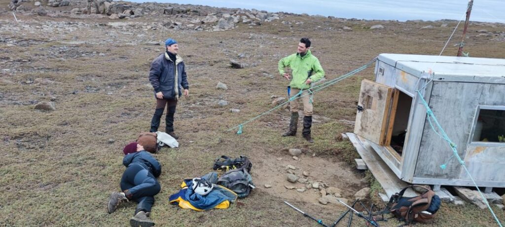 On s’attelle donc à changer le GPS de précision de la station qui ne marche plus, avant de prendre le départ des 3h de marche qui nous séparent de la cabane (point rouge sur la carte)