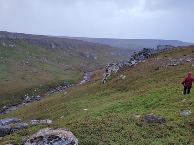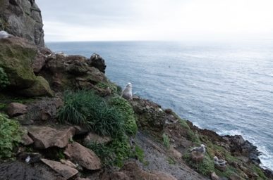 Tous les jours c’est une grimpette de 30 min un peu raide pour sortir du Canyon, mais la vue en vaut la peine ! Puis la même en descente de l’autre côté, assurés par des cordes que nous avons installées à notre arrivée pour la descente jusqu’à la colonie (point noir sur la carte). Nous passons donc notre journée au milieu des poussins qui nous attendent sagement sur leurs nids. En fait, ils ne sont pas si sages, ils nous griffent, nous donnent des coups de bec déjà bien tranchant et, à l’occasion vomissent ou défèquent sur nous pour agrémenter nos journées de belles odeurs.