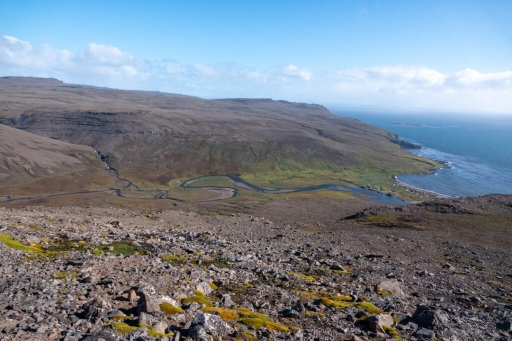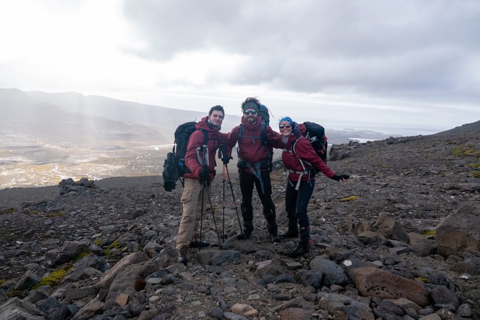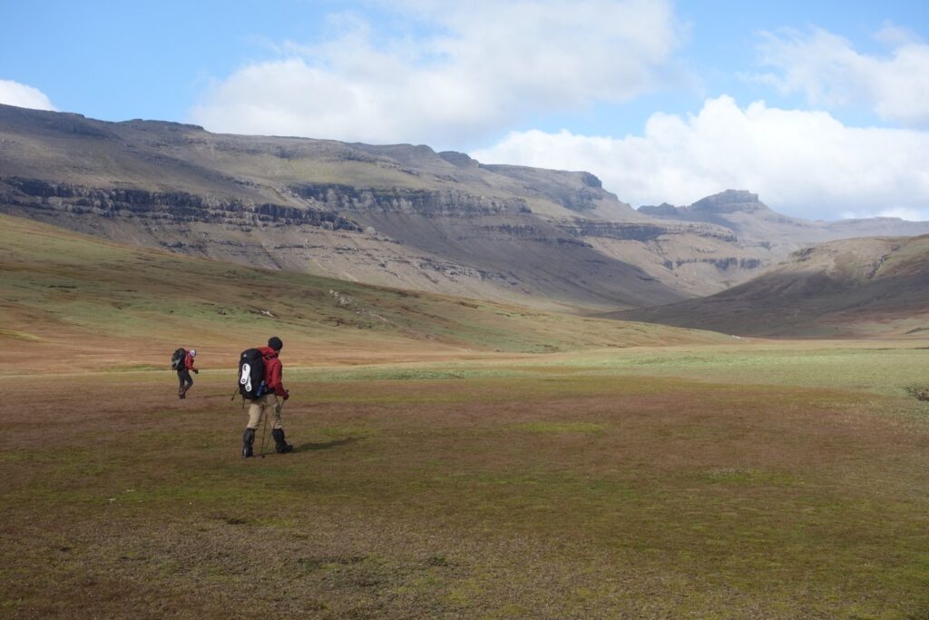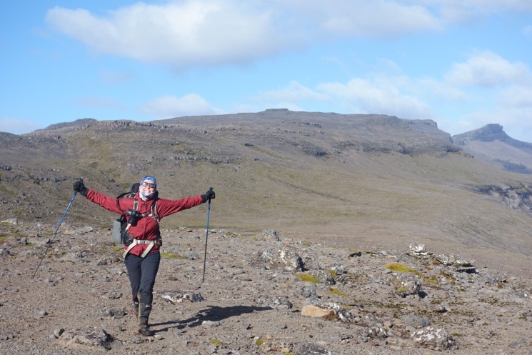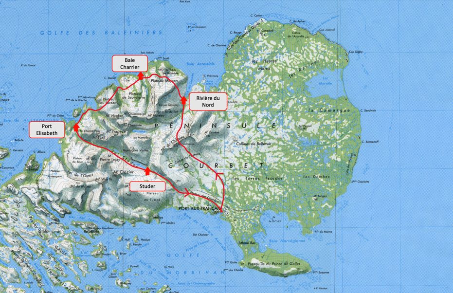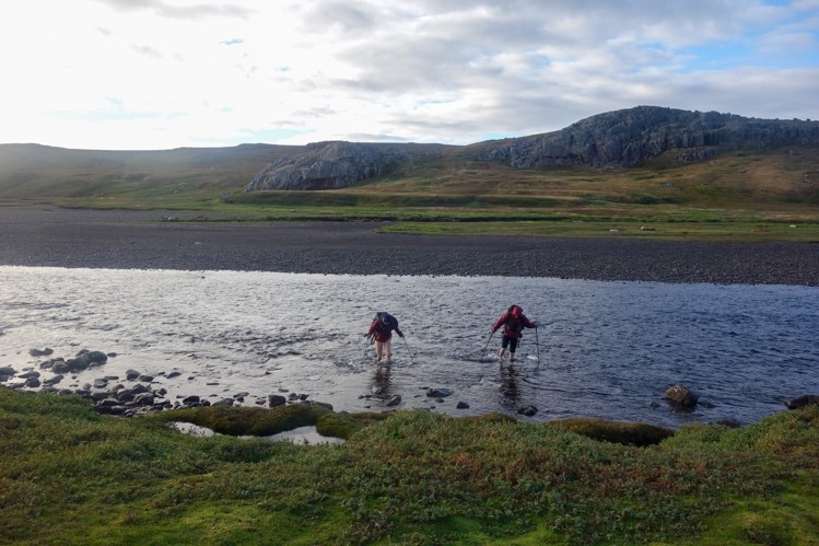 Le deuxième jour commence par une traversée de rivière trèèèès froide, en tenue règlementaire slip-crocs. Ca nous réveille et nous met en jambe pour cette belle journée sur les plateaux rocheux, qui nous amènera à Baie Charrier.