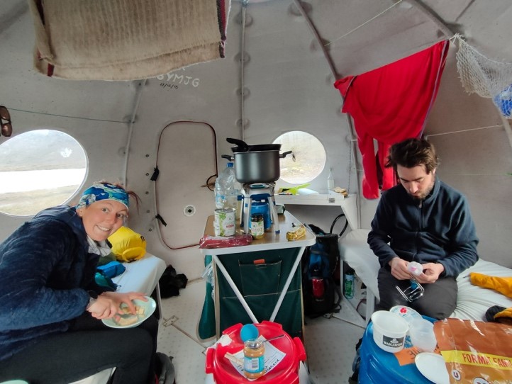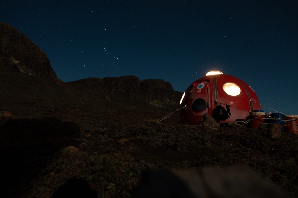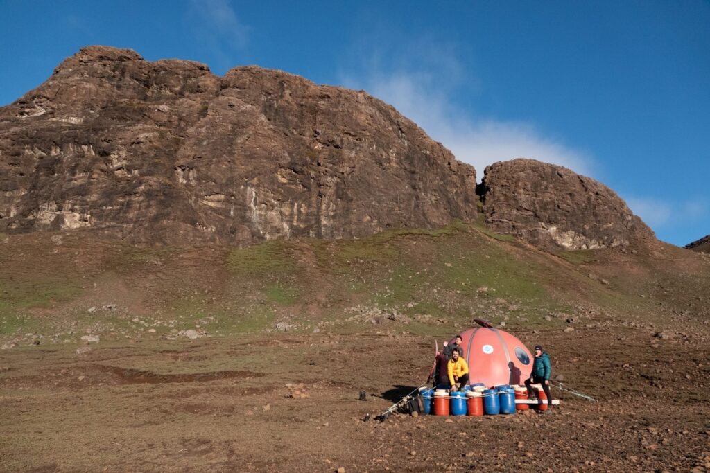 La cabane soyouz de Port Elisabeth, test (non concluant) de cabane facile à installer et transporter. Mais pas du tout adaptée au climat de Kerguelen, car avec l’humidité il pleut de la condensation au petit matin.