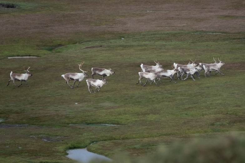 Je croise enfin mes premiers troupeaux de rennes. Ils ont été introduits au temps des baleiniers, pour avoir une réserve de viande fraiche, mais ils ont colonisé l’archipel en faisant de gros dégâts sur les zones humides et font maintenant l’objet de régulation.